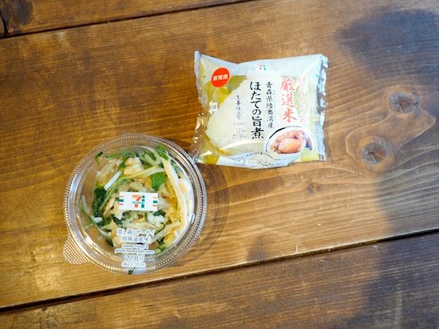 今回使うおにぎりは、セブンイレブンで新発売となった陸奥湾産のほたてをショウガで仕立てた「ほたての旨煮」おにぎりと、お惣菜の「蒸し鶏とザーサイ」。蒸しザーサイはネット上でも「うますぎてヤバい」と評判になっているみたいですね。