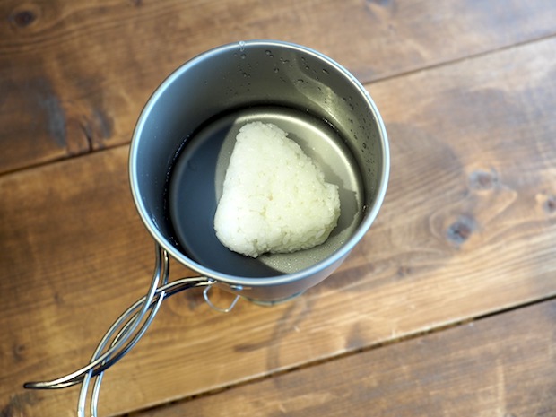おにぎりと水100㏄程度を入れて崩しながら5分ほど煮ます。