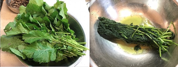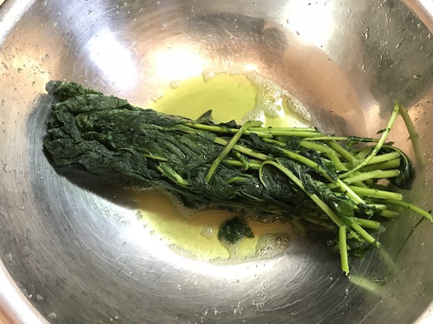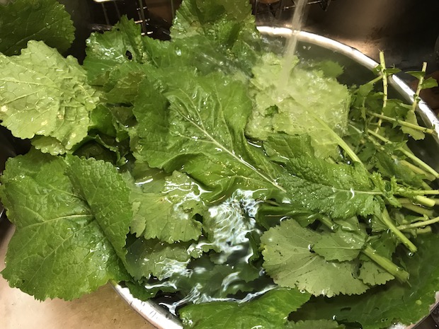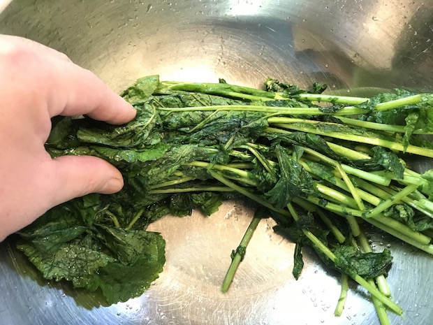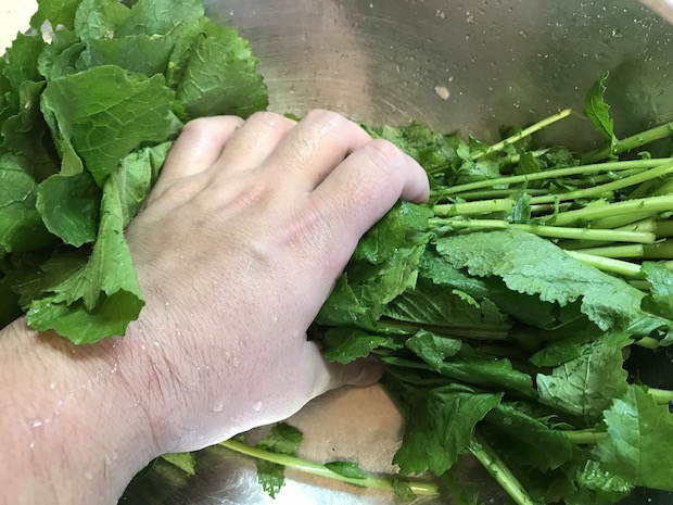 最終的には大きなボウルいっぱいのカラシナが、ひとつかみになってしまう。
