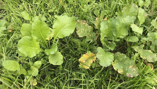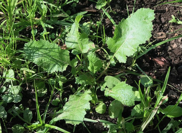 これがカラシナ。ギザギザのある葉と、かじった時に感じる辛味が特徴。正しくは「セイヨウカラシナ」となるようだが、近い種類と交雑することもあるのか、あるいは近似種が紛れているのか、典型的なタイプから「カラシナ?」と疑いたくなるものまである。