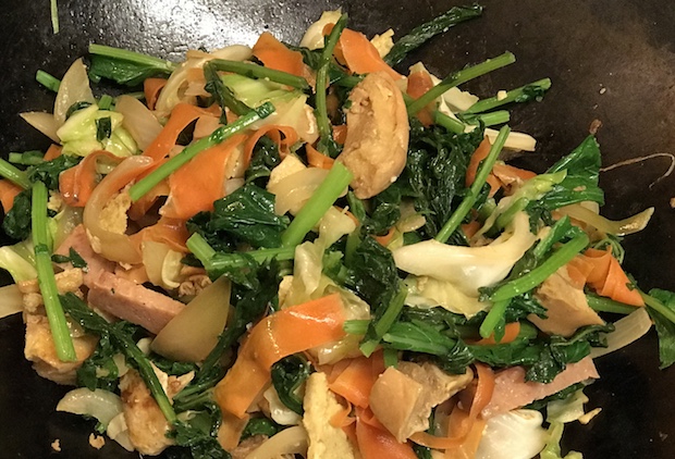 想像チキナーチャンプル。水で戻した車麩を絞って溶き卵をからめ、塩を抜いたチキナー、スパム、キャベツ、タマネギ、ニンジンと一緒にごま油で炒める。最後にちょちょっと醤油とみりん、鰹節で調味して完成。こちらもしみじみ美味かった。本物を食べたことないのでこれが正解とはいえないが、これまで食べてきたチャンプルと比べると、だいたいこの方向性で合っている気がする。思わぬ効果だが、時間が経っても車麩が水気を吸い込むので汁気が出ない。そして汁気を吸った車麩が美味い。自分の人生に、麩のことを美味いと思う時が来るだなんて想像もしなかった。車麩は、多めのほうが美味しいぞ。