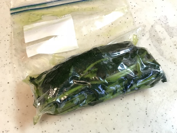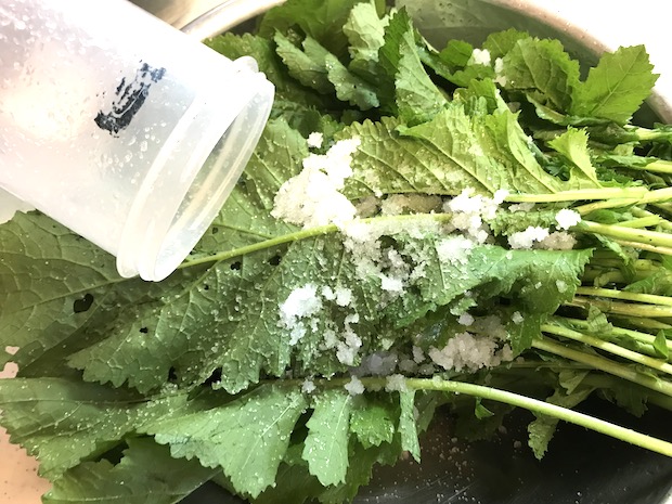 持ち帰ったものを丁寧にすすいで、塩を振ってもんでみる。最初のうちは嵩を保っているが、あるタイミングをすぎると急にしんなりして小さくなった。これをジップロックに入れてひと晩放置する。