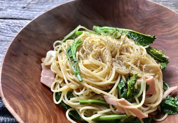 カラシナの花芽は春の味。ベーコンと一緒にパスタにしたり、さっと湯がいておひたしにしても美味しい。