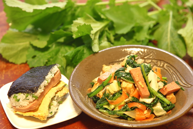 続けて作ってみたのは、ネットでざざっと検索したレシピで作ったチキナーチャンプルと菜飯スパむすび。