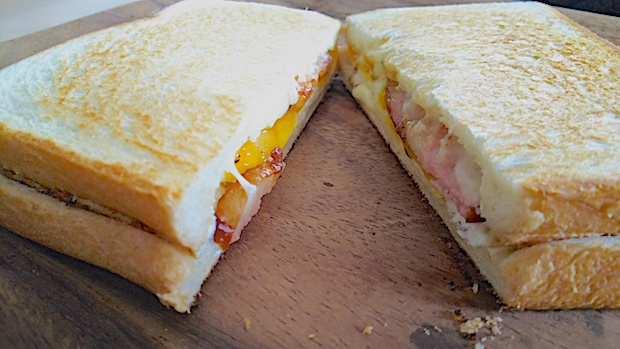ノーマルホットサンドの定番ですね。以前、私が食したときに感動? して「勝手に選手権」企画をやろうと思ったメニューです。こちらは開きやすく、軽い、両面焼けるヨシカワのホットサンドメーカーにてつくりました。
