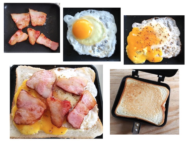 つくりかた:目玉焼きとベーコンを別々に焼き、皿に取り分けます。目玉焼きは半熟でベーコンはカリっとなるくらいがオススメです。食パンにバターを塗って、チーズ、タマゴ、ベーコンをのせ、ハーブソルトをかけて挟み焼きします。キャンプでもできる定番、鉄板の王道ホットサンド。まちがえようがないオイシさ。チーズがとろけていて、半熟目玉焼きの黄身もとろっとし、かりっと焼いたベーコンの塩気がまとめている。そりゃマズいわけがない。