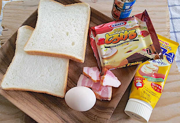 食パン角8枚切り2枚、バター少々、卵1個、ベーコン4枚、とろけるチーズ1枚、ハーブソルト少々