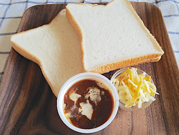 角切り食パン6枚切り2枚、ハッシュドビーフソース30g、シュレッドチーズ10g