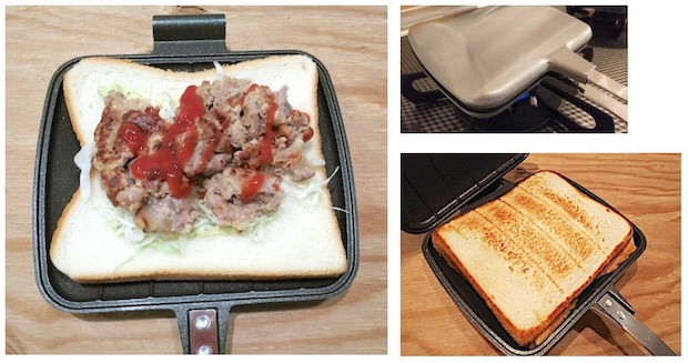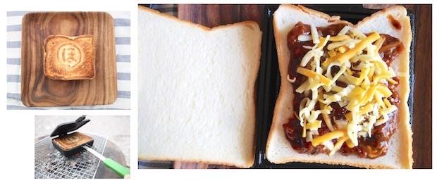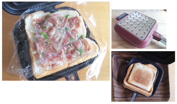 つくりかた:底板にパンを置き、ハッシュドビーフソースを乗せます。残り物やレトルトで大丈夫、あまり欲張らないで少なめに入れたほうが無難かも。チーズもかけてふたにパンをのせて焼きます。ソースはあたためておいたものを入れたほうがいいですね。パンに「ほ」がついて、とろっとチーズとソースがでてくれば問題ないでしょ。ハヤシパン? いやハッシュドパンの完成です。これ、もちろんカレーでもいいと思います。レトルトの味があれば無限です。食べるときあふれ出るので注意です。