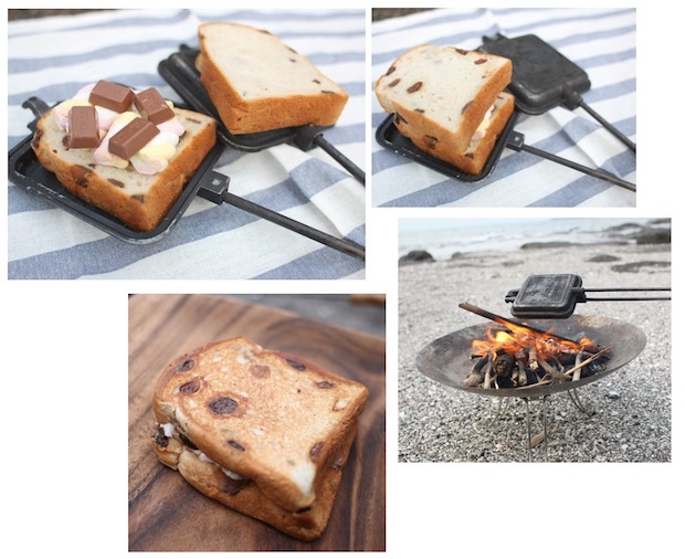 つくりかた:コフランのキャンプクッカーは焼面が小さめなので、パンを小さいものでつくってみました。チョコとマシュマロは、あまり欲張って入れないほうがいいです。なぜなら破裂すると大変なことになります。焚き火などでじっくり裏表をちょこちょこひっくり返すといいでしょう。クッカーにちょっと油をつけておいたほうがいいかもしれません。レーズンが表面にこびりつきやすいです。味は想像どおり、スモアです。甘いです。めちゃくちゃあまかったです。