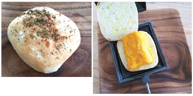 最近ちょっと流行っているのを知っていますか? 玉子焼きをサンドイッチにしているのがあるのです。それをホットサンドにしてみました。それもちょっとがんばってフォカッチャを自作しまして、使ってみました。最後は自分で買ったコフラン×A&Fのクッカーを使っています。