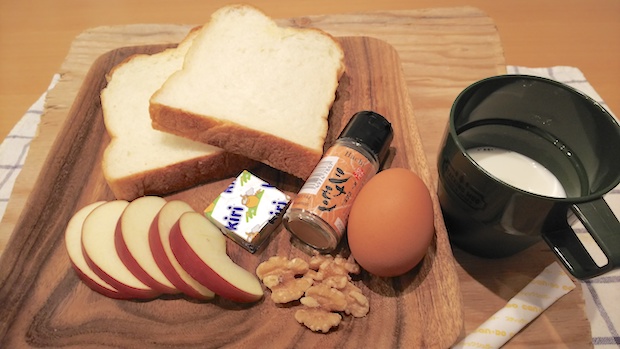 ホテル食パン6枚切り2枚、牛乳30cc、砂糖15g、卵1個、リンゴ1/4個、クリームチーズ10g、くるみ5g、シナモン少々