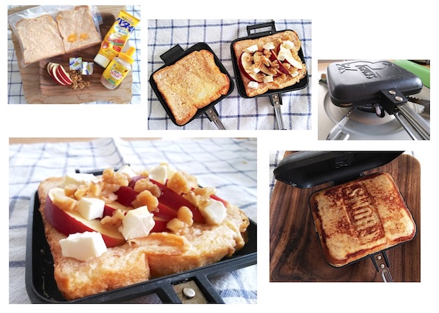 つくりかた:牛乳、砂糖、卵を密閉袋に入れ、混ぜ合わせておきます(できれば、前日の下準備として)。パンを入れ浸しておきましょう。クッカーの下になるほうに一枚浸したパンをのせ、薄切りにしたリンゴ、ちぎったクリームチーズ、細かく切ったくるみ、シナモンを少々かけます。上にパンをのせ挟み、焼きます。焦げやすいので注意してくださいね。ふわっとした甘いフレンチトーストにシャキッとした食感の残る酸味のあるリンゴ。くるみのアクセントにクリームチーズがたまりません。ちなみにクリームチーズのことを業界? ではクリチといいます。ま、私は言いませんが(笑)。けっこう厚くなりますが、ヒンジの部分が大きめにとれるチャムスのクッカーだとやりやすかったです。テフロン加工がされているので、卵液のパンがこびりつくこともありません。