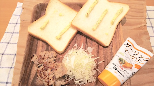 角切り食パン6枚切り2枚、ハンバーグ1個(既製品でも手づくりでも)、ガーリックマーガリン適量、千切りキャベツ