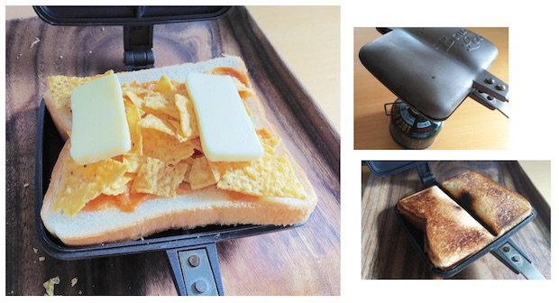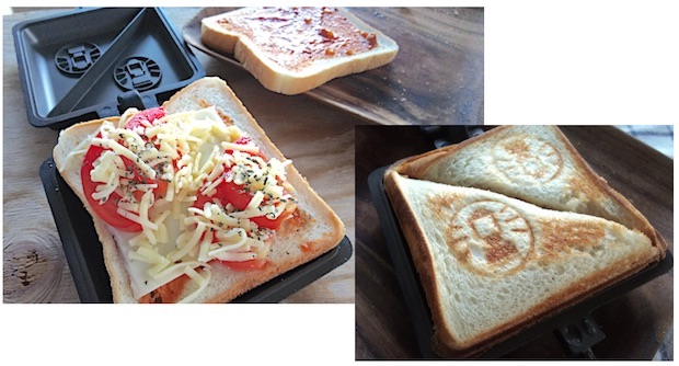 ええ、ピザです。ピザトーストのホットサンドです。ひねりもへったくれもありません。でも、おいしいんだもん。いいじゃないですか。定番なので、メジャーなコールマンのホットサンドメーカーでつくって、ランタンマークつけてみました。