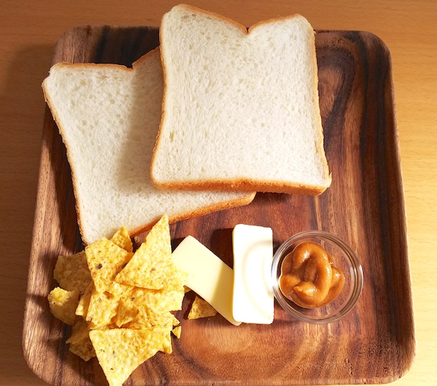 角切り食パン6枚切り2枚、味噌10g、バター10g、トルティーヤチップス20g
