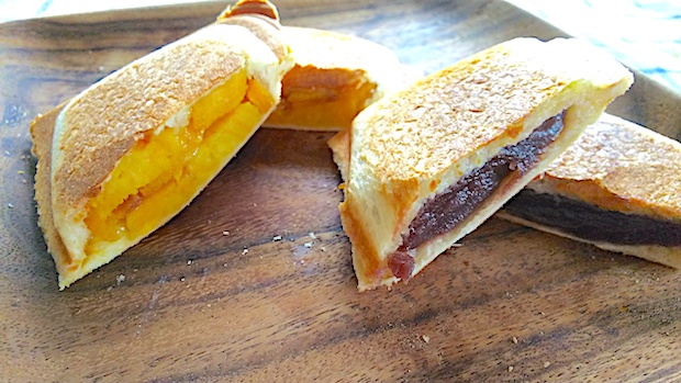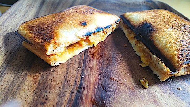つくりかた:角切り食パン8枚切りは耳を落として使います。焼き芋オレンジサンドのほうの焼き芋はスーパーで売っているものでも、キャンプでつくったものの余りでもOK。薄切りにしてパンにのるサイズにします。パンにバターを塗り、切った焼き芋を乗せます。その上にマーマレードジャムをのせてパンで挟みましょう。あんバターはそのまま、パンにあんこをのせ、バターをのせればOK。そして2個いっぺんにプレスして焼きます。耳を落としている部分がカリっとしていて、焼き芋はふわっとあたたかいのにマーマレードジャムがとろっとでてきます。あんバターもまちがいないおいしさ。甘い、しょっぱいののベストマッチ。小さめなのでぺろっと食べられちゃいます。