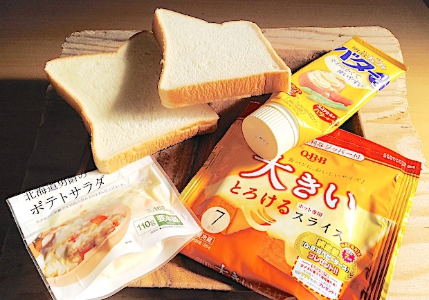 角切り食パン8枚切り2枚、ポテトサラダ100g、大きなとろけるチーズ2枚、バター適量