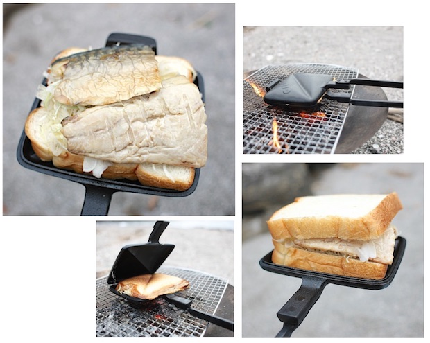 つくりかた:パンに焼きサバを豪快にのせ、キャベツとチーズをのせて、食パンではさみます。Oigenのホットサンドメーカーはぎゅっとプレスしやすいので、肉厚ですがばっちりとはさみましょう。今回は焚き火で、遠目、じっくり目でやきました。焼き上がりは、サバの油がしみでていい香りがし、日本の朝食の雰囲気です。食べた瞬間、カリジュワです。塩サバとチーズの塩気をキャベツが吸収してくれていておいしさ抜群でした。最近のレトルトは骨もとってくれているので、食べやすかったです。アリですねこれは。