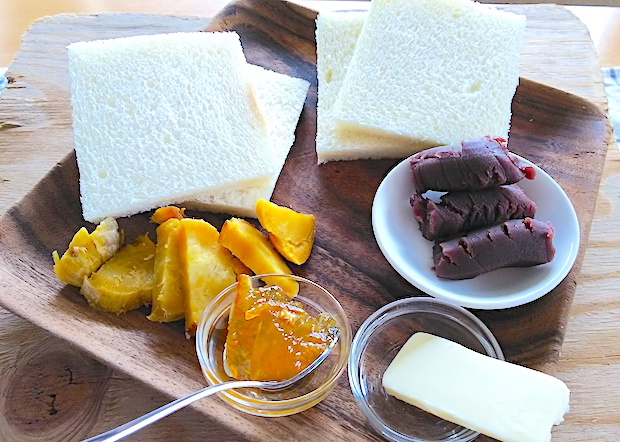 焼き芋1/2本、オレンジマーマレードジャム15g、角切り食パン8枚切り あんこ20g、バター10g、角切り食パン8枚切り2枚