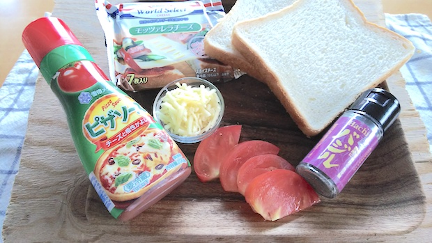 角切り食パン8枚切り2枚、ピザソース適量、モツァレラチーズ1枚、トマト1/4個、シュレッドチーズ10g、バジル少々