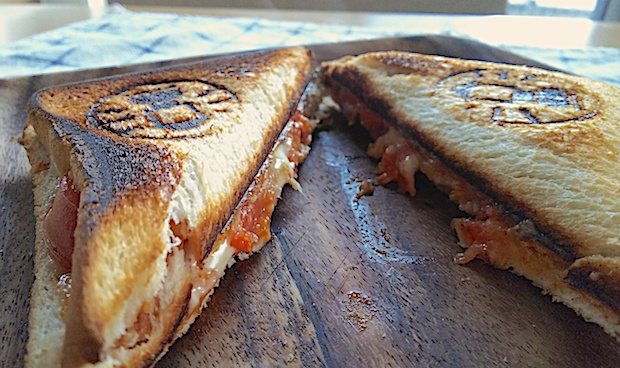 つくりかた:パンにピザソースを2枚とも塗ります。下になるほうの食パン一枚にモツァレラチーズをのせ、トマトの上にシュレッドチーズ、バジルをかけます。コールマンのホットサンドメーカーは斜め半分、三角に切れるので乗せる位置を気をつけて、上のパンをのせてプレスして焼きます。焼けたホットサンドを切るときに流れ出るピザチーズは、狙っているのかと思えるほどにおいしそうに見えます。ま、想像通りの味ですが、だからこその人気メニューなのでしょうね。私はあたたかいフレッシュトマトが好きです。なんでしょうね、サラダのときとはちがった顔を見せるのがにくいというか、愛らしいというか。どうだ凄いだろって言っているようです。