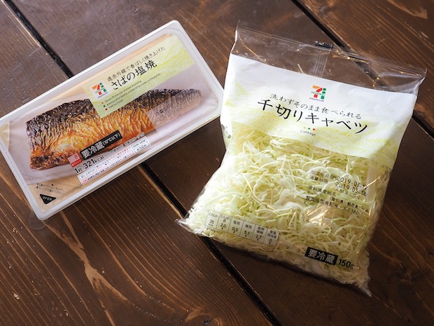セブンイレブンのサバは脂がのっててジューシーで、さらにはなんとまったく骨がない!! 今回は見栄えのためにカットしたけど、箸でほぐれるから全部ほぐして千切りキャベツに入れて全部混ぜちゃってもOK。