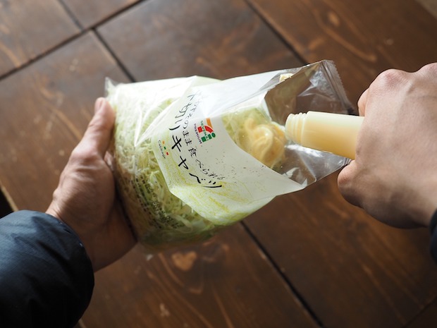 さて、まずは千切りキャベツの袋を開けてコショウを振ってマヨネーズをビューっと入れてかき混ぜます。モミモミしてスプーンや箸でかき混ぜて。