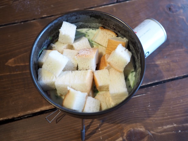 かき混ぜながら、かたわらでパンを一枚大きめのサイの目にカットします。カットしたらバラバラと小鍋に入れてしまいましょう。