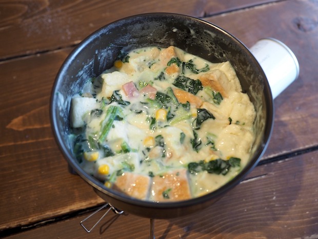 ホワイトソースでもないしオーブンで焼いてるわけでもないんだけど、ちゃんとグラタン! ほうれん草とベーコンとコーンも入ってて具だくさんだし、パンもボリュームあって満腹度高い! ふたりで作っても満足度高いし、途中で“追いチーズ”しても贅沢でいいよね。
