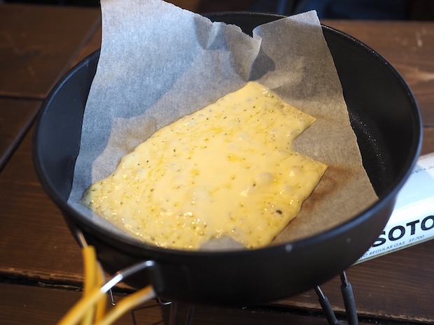 写真のようにフライパン側が焦げて少し煙が出てくるくらいが頃合いです。このまま小鍋の上にスルッと載せましょう。次の写真のように、絵的にはひっくり返した方がおいしそうですが、ひっくり返すのは難しいので各自の判断にお任せします。
