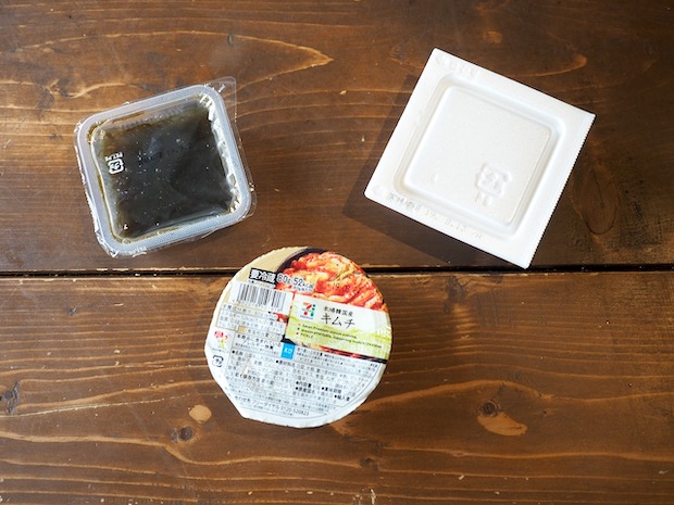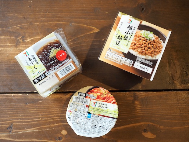 もずく、納豆、キムチの3種。ただ、セブンのもずくと納豆は3個パックなのです……。