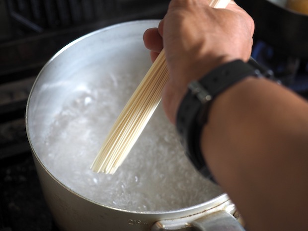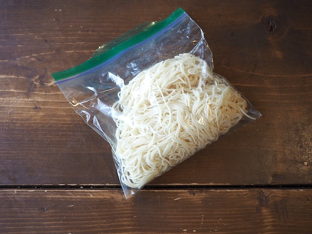 それではここからが現場の調理。ジップロックのそうめんを器にあけて……。
