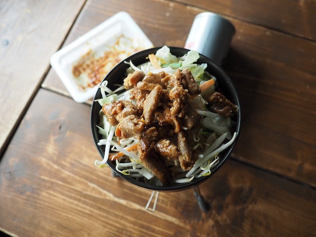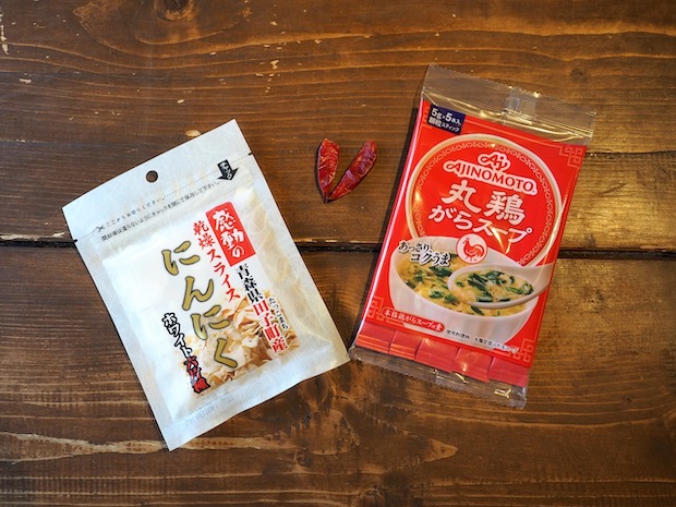 にんにくと唐辛子と鶏ガラスープ。にんにくは乾燥にんにくが使いやすいけど普通に生のモノをひとかけ持っていってもOK。唐辛子は鷹の爪でも輪切りでもパウダーでもOK。