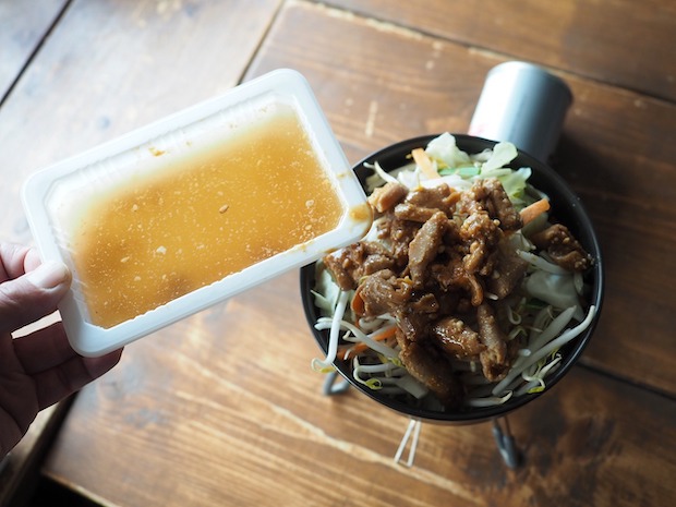 ホルモンが入っていたパックに水を入れて計量します。これはタレを洗う意味もあるわけです。水の量はすり切りじゃなくて大丈夫。適度なら問題ありません。箸でシャカシャカしてキレイに洗いましょう。