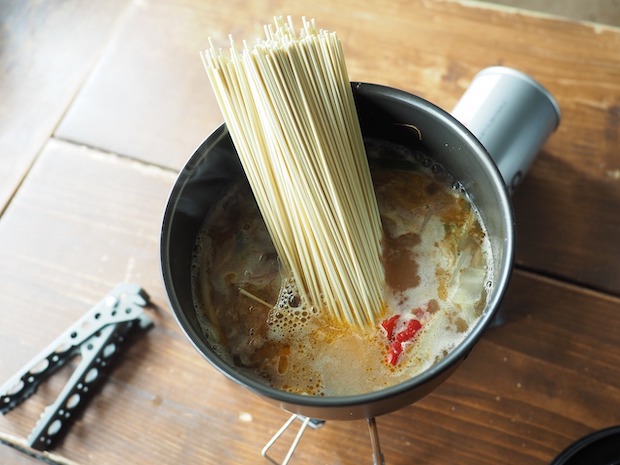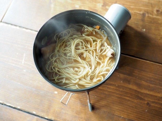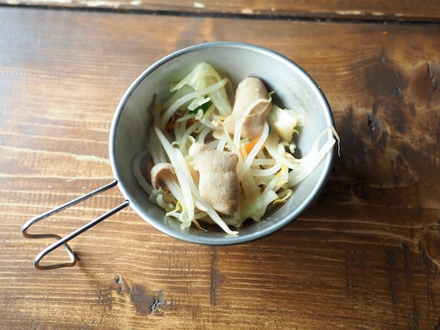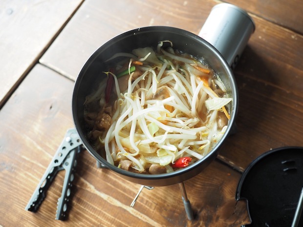 野菜のカサは煮ると減るので1L~1.5Lクラスのコッヘルで写真のように盛り上がるくらいがオススメ。それ以上小さいなら2回に分けて食べよう。