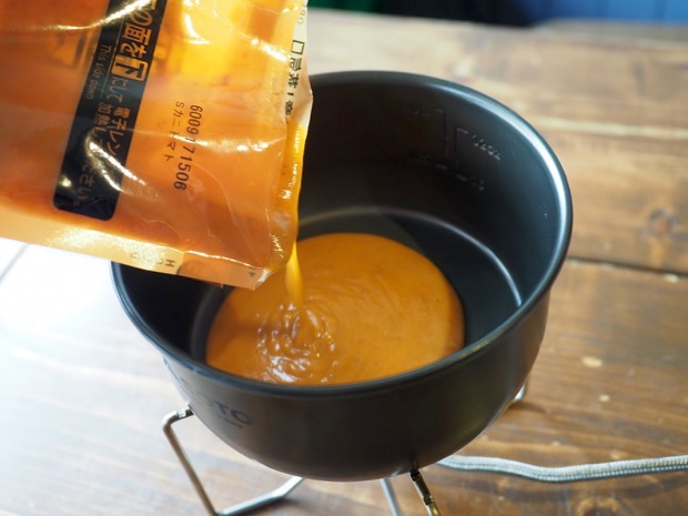 まずはコッヘルにパスタソースをあけます。火はまだ付けません。
