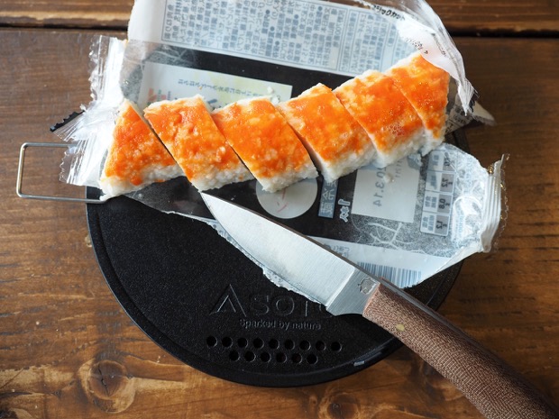 カニカマを切ります。コッヘルに入れてからスプーンなどで切ってもいいですよ。