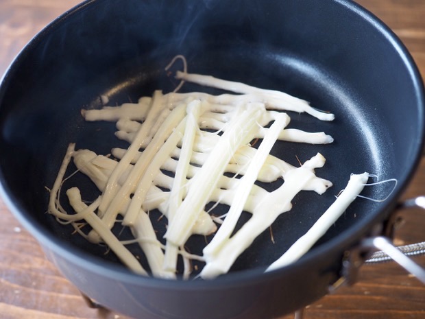 さけるチーズを割いて平らに並べます。ナイフなどでカットしたものでもOK。これを弱火で焼いていきます。煙が出てくるまで焼きましょう。