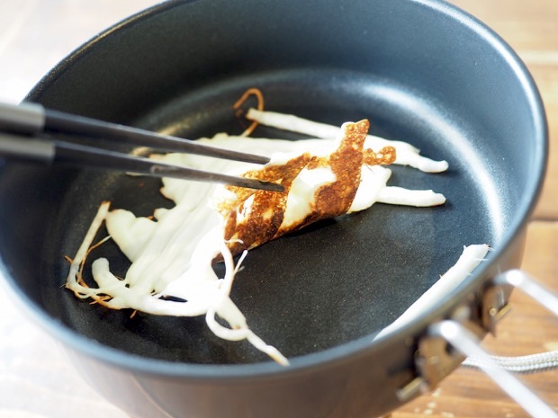 煙が出てきてビビるのですが、しばらくそのまま。チーズが油を出していい感じに焦げてきます。で、めくれるくらいになったら完成。