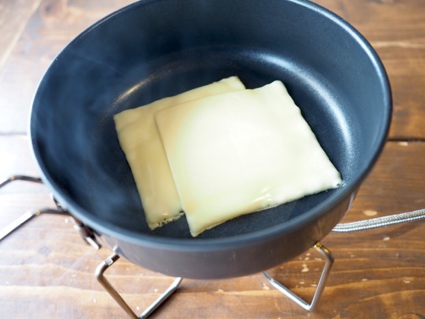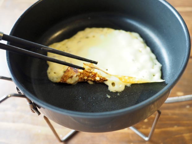 が、しかしトロトロがすごいので避けるチーズと同じようにハシでつまんでは載せられません。スライドしてフライパンから滑らせるようにして載せましょう。仕上がりの焦げ目は見えませんが、見た目は置いておいて味はスライスチーズの方がおいしい!