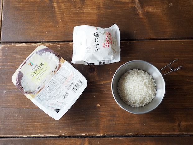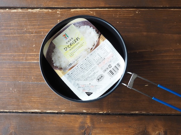 炊飯ではありませんがアウトドアごはん&コンビニ食材で手っ取り早く米を用意するとなったらコレが一番早い。温かくするためには蒸すしかありません。蒸すという行為は意外なほど簡単だしコッヘルもほぼ汚れない。