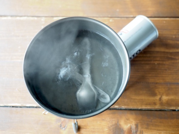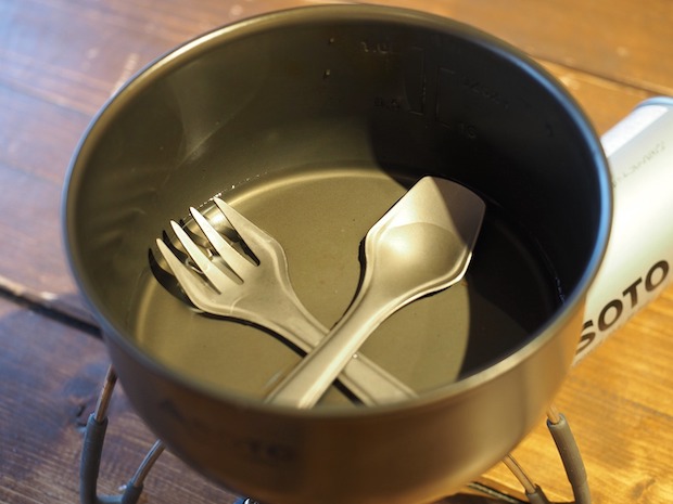 コッヘルに少量の水を入れてカトラリーをクロスさせて置きます。