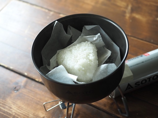 冷たかった塩むすびがすっかり温かくなっています。これは蒸すために道具を工夫することだけできれば結構使えるテクニックですよ! なお蒸すときはコッヘルが空焚きにならないように注意しましょう。