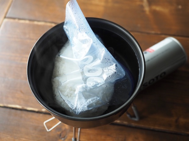 しかしパックご飯の中身だけ取り出して蒸すというのもアウトドアではなかなか大変。パックご飯がそのまま入るくらいの大きめのコッヘルに限定されてしまうが、パックのまま蒸すことを推したい。