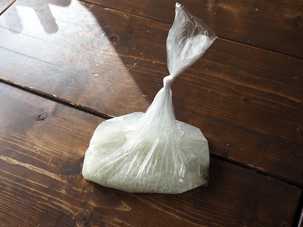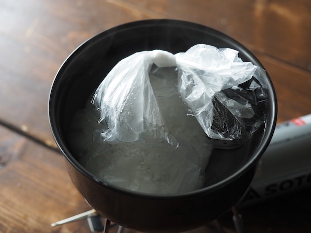 沸騰した水の中にポリ袋ごと入れてフツフツするくらいの火加減で20分ほど湯煎すればよい。この際、ポリ袋の中の空気はできるだけ抜いておこう。ただし、結び目は袋の上の方で! これは米が水を吸って膨らむスペースを確保するため。空気を抜いたあと遊びがない状態で結んでしまうと最悪ポリ袋が破裂してしまう!