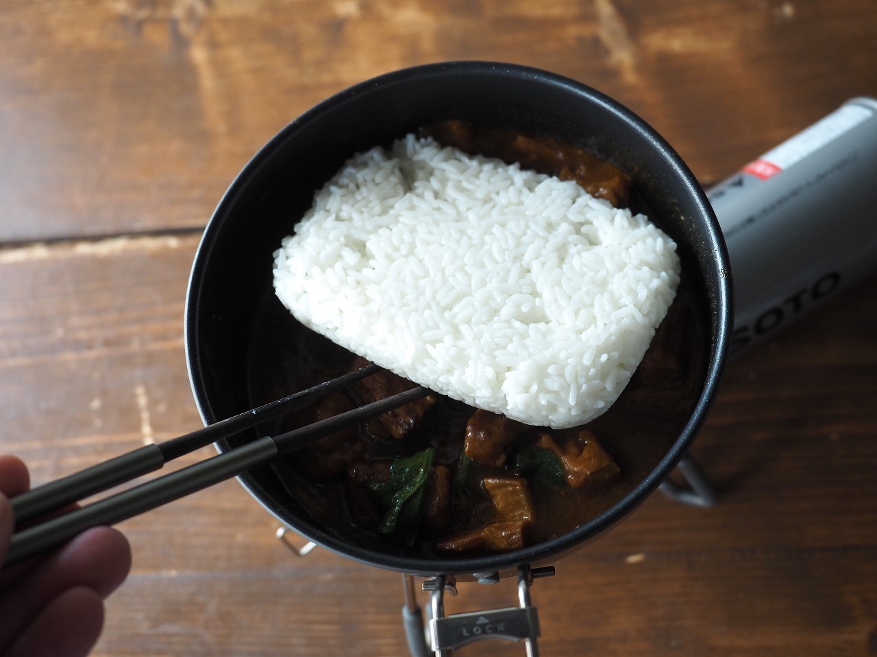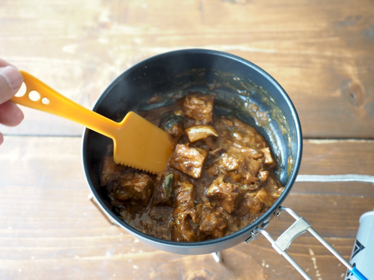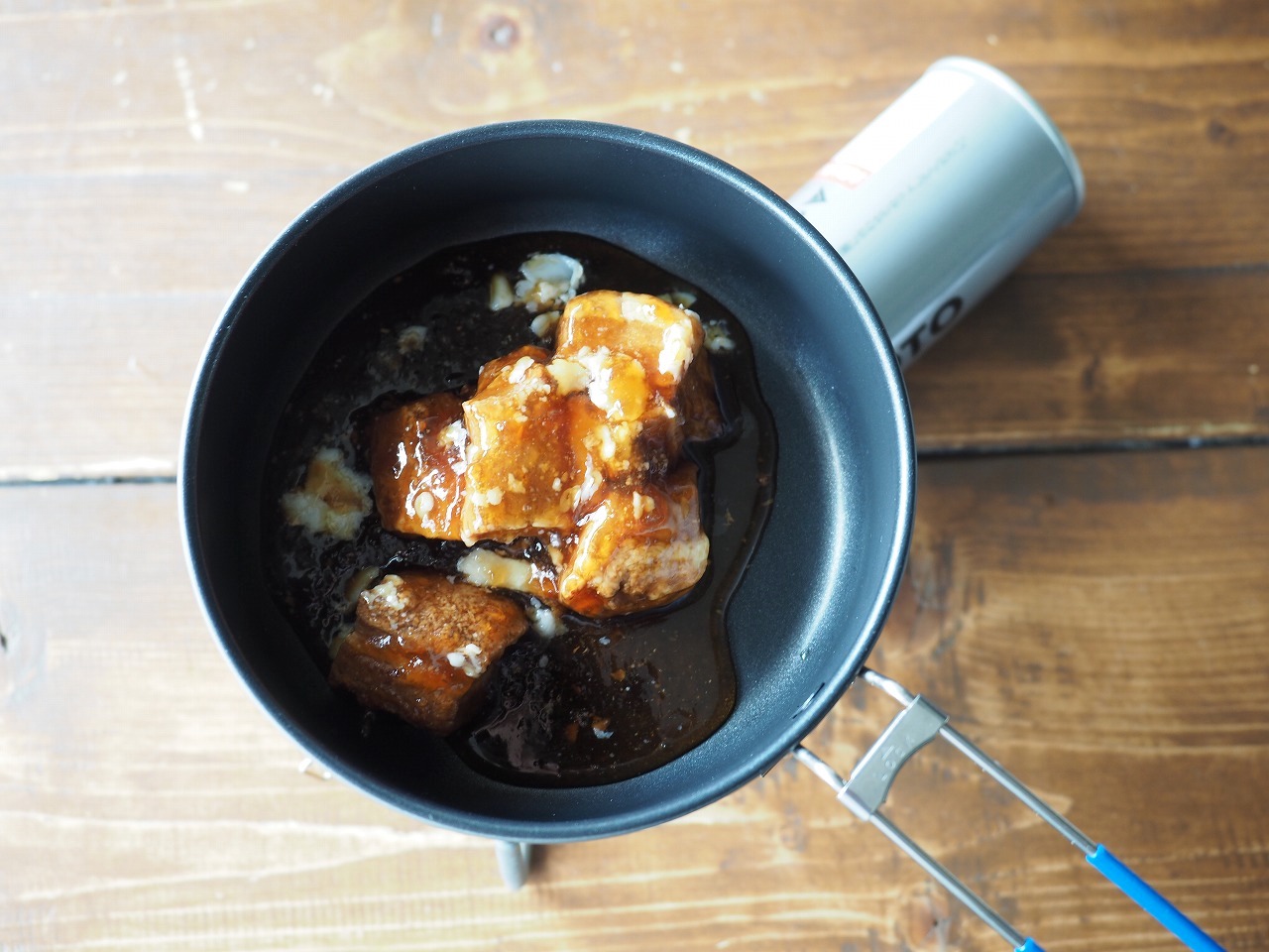 コッヘルに角煮をあけて加熱していくわけですが、加熱とともに水分が蒸発していくので、角煮をコッヘルに移したらまずはコップ1/2くらいの水を足します。