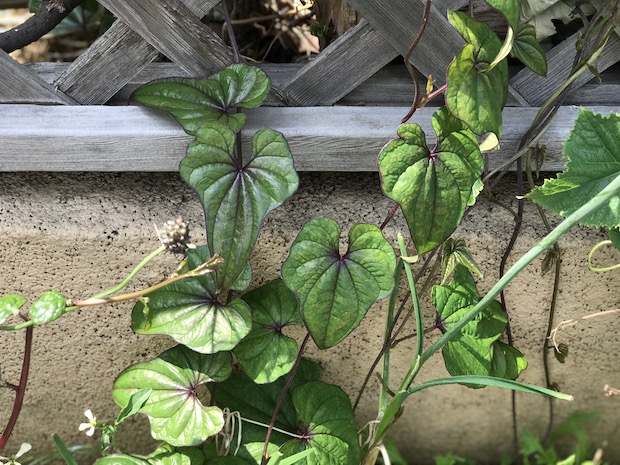 おなじく、省スペースで農薬いらずの作物がナガイモ。こちらは1年に1度しか収穫できないが、つるを縦方向に伸ばすので敷地が狭くても栽培できる。秋に収穫して根塊の上部を埋め戻しておけば、翌年も収穫できる。肥料なしでもよく茂り、ほかのつる植物よりもつるが伸びるのが早い。病気や害虫にも強いのでグリーンカーテンにもぴったりだ。キュウリやゴーヤと比べても、痩せた土でもよく葉を茂らせる。