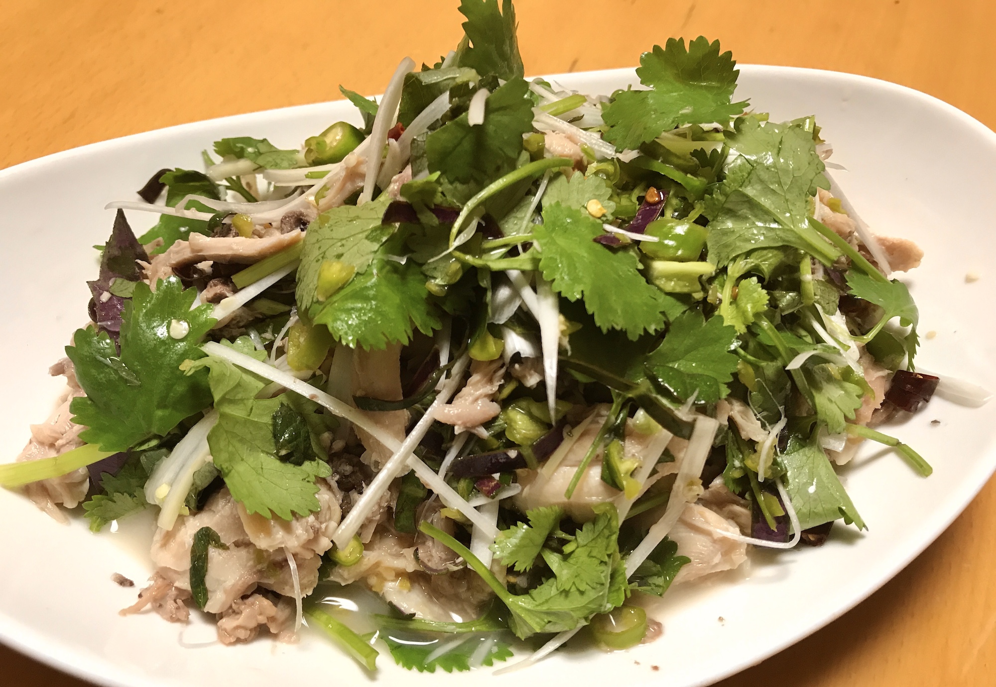 檸檬鶏には白髪葱、パクチー、ミツバ、大葉、タマネギのスライス、ホーリーバジルなど、クセのある香草が合う。これらとゆで鶏をワシワシ混ぜて、青唐辛子のソースで食べる(薬味のところで書き忘れていたが、ホーリーバジルはぜひ庭にほしい。サラダに入れたときのアクセントは抜群だし、干してお茶にしてもいい)。