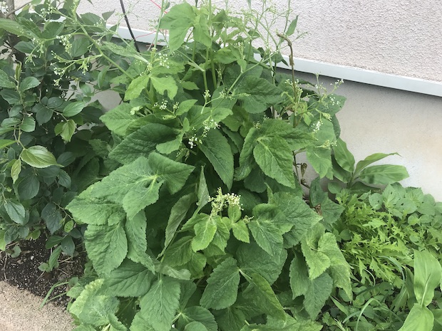 ミツバもどこでもよく育つ。しかし、あっという間に育って硬くなってしまうので、市販されているミツバのように束にしておひたしなどに使うのは意外と難しい。うちでは春先の若いものをバサっと刈り取り、サグカレーの要領でペースト状のカレーにしている。